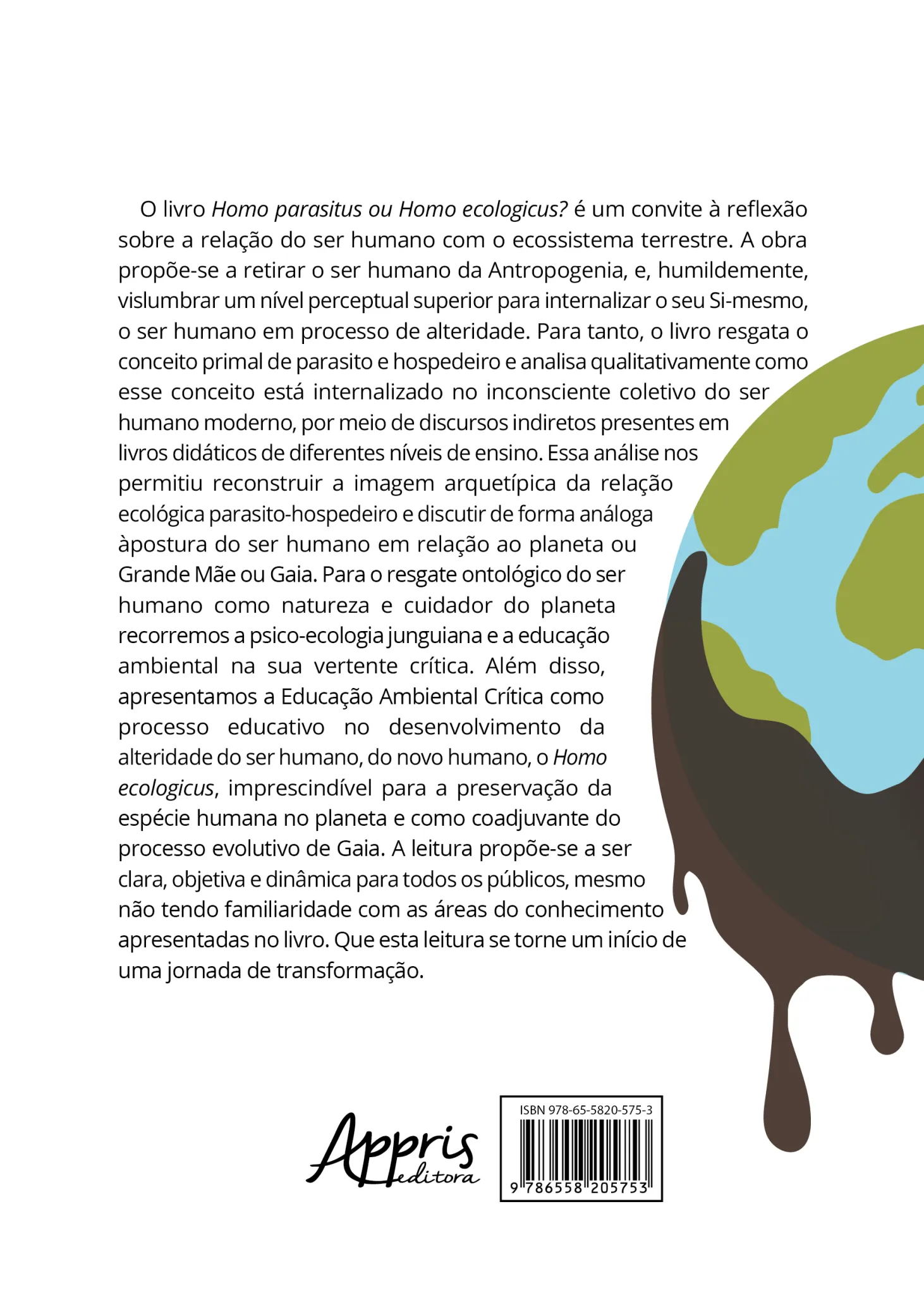 O livro Homo parasitus ou Homo ecologicus? é um convite à reflexão sobre a relação do ser humano com o ecossistema terrestre. A obra propõe-se a retirar o ser humano da Antropogenia, e, humildemente, vislumbrar um nível perceptual superior para internalizar o seu Si-mesmo, o ser humano em processo de alteridade. Para tanto, o livro resgata o conceito primal de parasito e hospedeiro e analisa qualitativamente como esse conceito está internalizado no inconsciente coletivo do ser humano moderno, por meio de discursos indiretos presentes em livros didáticos de diferentes níveis de ensino. Essa análise nos permitiu reconstruir a imagem arquetípica da relação ecológica parasito-hospedeiro e discutir de forma análoga àpostura do ser humano em relação ao planeta ou Grande Mãe ou Gaia. Para o resgate ontológico do ser humano como natureza e cuidador do planeta recorremos a psico-ecologia junguiana e a educação ambiental na sua vertente crítica. Além disso, apresentamos a Educação Ambiental Crítica como processo educativo no desenvolvimento da alteridade do ser humano, do novo humano, o Homo ecologicus, imprescindível para a preservação da espécie humana no planeta e como coadjuvante do processo evolutivo de Gaia. A leitura propõe-se a ser clara, objetiva e dinâmica para todos os públicos, mesmo não tendo familiaridade com as áreas do conhecimento apresentadas no livro. Que esta leitura se torne um início de uma jornada de transformação.
