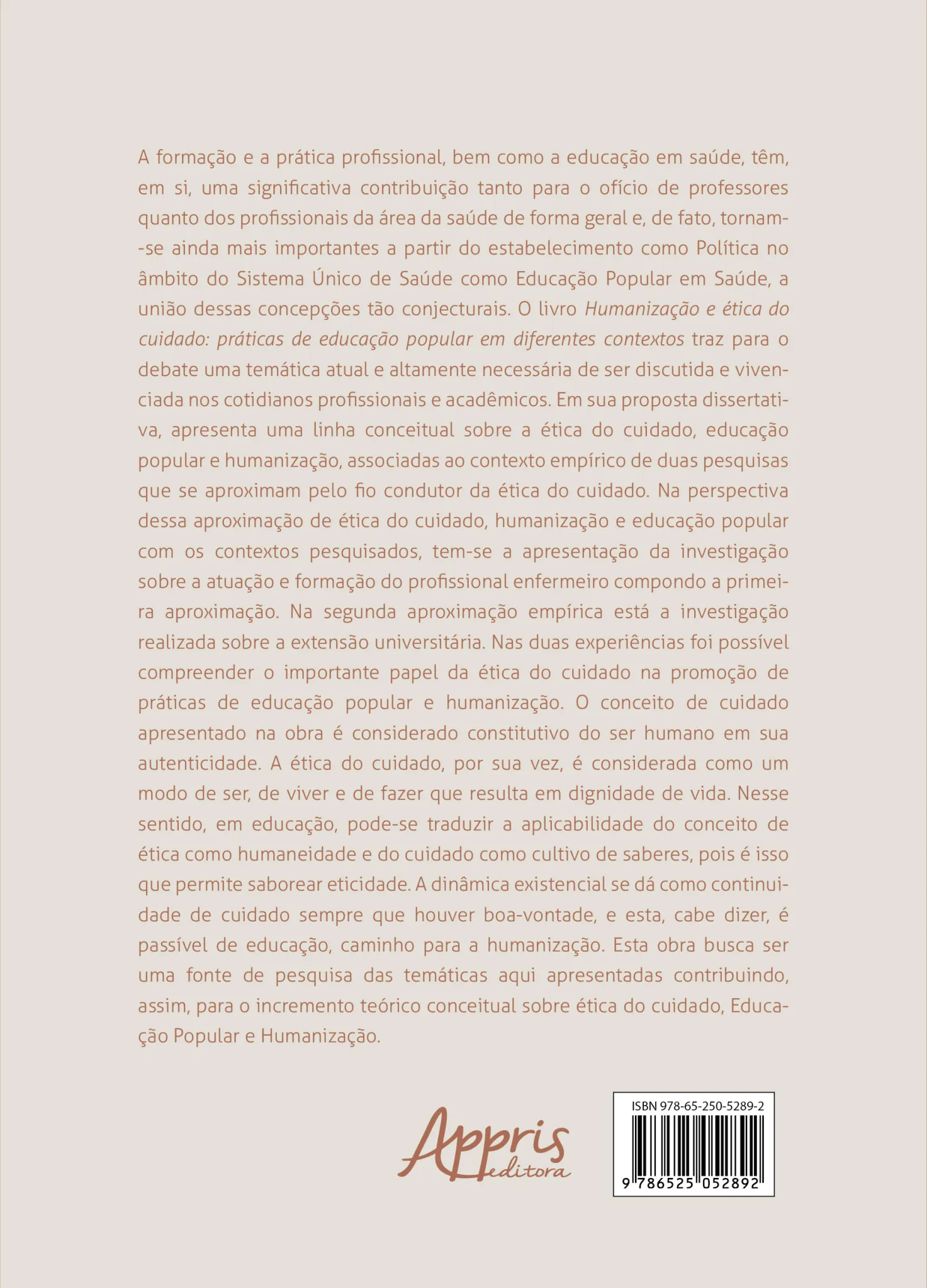 A formação e a prática profissional, bem como a educação em saúde, têm, em si, uma significativa contribuição tanto para o ofício de professores quanto dos profissionais da área da saúde de forma geral e, de fato, tornam-se ainda mais importantes a partir do estabelecimento como Política no âmbito do Sistema Único de Saúde como Educação Popular em Saúde, a união dessas concepções tão conjecturais. O livro Humanização e ética do cuidado: práticas de educação popular em diferentes contextos traz para o debate uma temática atual e altamente necessária de ser discutida e vivenciada nos cotidianos profissionais e acadêmicos. Em sua proposta dissertativa, apresenta uma linha conceitual sobre a ética do cuidado, educação popular e humanização, associadas ao contexto empírico de duas pesquisas que se aproximam pelo fio condutor da ética do cuidado. Na perspectiva dessa aproximação de ética do cuidado, humanização e educação popular com os contextos pesquisados, tem-se a apresentação da investigação sobre a atuação e formação do profissional enfermeiro compondo a primeira aproximação. Na segunda aproximação empírica está a investigação realizada sobre a extensão universitária. Nas duas experiências foi possível compreender o importante papel da ética do cuidado na promoção de práticas de educação popular e humanização. O conceito de cuidado apresentado na obra é considerado constitutivo do ser humano em sua autenticidade. A ética do cuidado, por sua vez, é considerada como um modo de ser, de viver e de fazer que resulta em dignidade de vida. Nesse sentido, em educação, pode-se traduzir a aplicabilidade do conceito de ética como humaneidade e do cuidado como cultivo de saberes, pois é isso que permite saborear eticidade. A dinâmica existencial se dá como continuidade de cuidado sempre que houver boa-vontade, e esta, cabe dizer, é passível de educação, caminho para a humanização. Esta obra busca ser uma fonte de pesquisa das temáticas aqui apresentadas contribuindo, assim, para o incremento teórico conceitual sobre ética do cuidado, Educação Popular e Humanização.