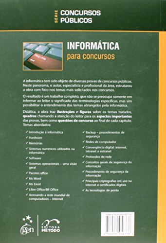 A informática tem sido objeto de diversas provas de concursos públicos. Neste panorama, o autor, especialista e profissional da área, estruturou a obra com foco nos temas mais solicitados nos concursos. O resultado é um trabalho completo, que não se preocupa somente em informar ao leitor o significado das terminologias específicas, mas sim possibilitar o entendimento dos temas abrangidos pela informática. Didática, a obra traz ilustrações e figuras sobre os temas tratados, quadros chamando a atenção do leitor para os aspectos importantes das provas, bem como questões de concurso ao final de cada capítulo.