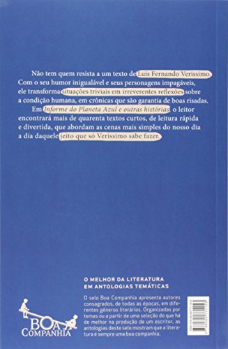 Uma antologia com mais de quarenta textos de leitura fácil e divertida, que abordam situações triviais de nosso dia a dia com o inigualável humor de Verissimo. Filho do craque da literatura Erico Verissimo, Luis Fernando Verissimo tem uma vasta obra que inclui centenas de contos e crônicas, além de romances, poemas e quadrinhos. Em Informe do planeta azul foram reunidos textos de diversas fases da trajetória do escritor, alguns deles publicados nos anos 1980 e 1990 e, em alguns casos, nunca mais republicados. As temáticas e personagens dos textos são muito variadas, passando pelas cenas mais cotidianas, até situações que beiram o absurdo, como a da mulher que, na sala de espera do consultório do dentista, lê sobre sua própria vida numa revista. Trechos do diário do dr. Frankenstein e a história do japonês que não sabia que a Segunda Guerra Mundial tinha terminado são apenas alguns exemplos do que você encontrará neste livro. Unanimidade, sucesso de crítica e de público, Verissimo é mesmo uma boa companhia e encanta leitores de todas as idades com seu olhar atento, inteligente e bem-humorado sobre os mais variados assuntos: literatura, tecnologia, convenções sociais, educação, pequenos dramas cotidianos, comportamento.