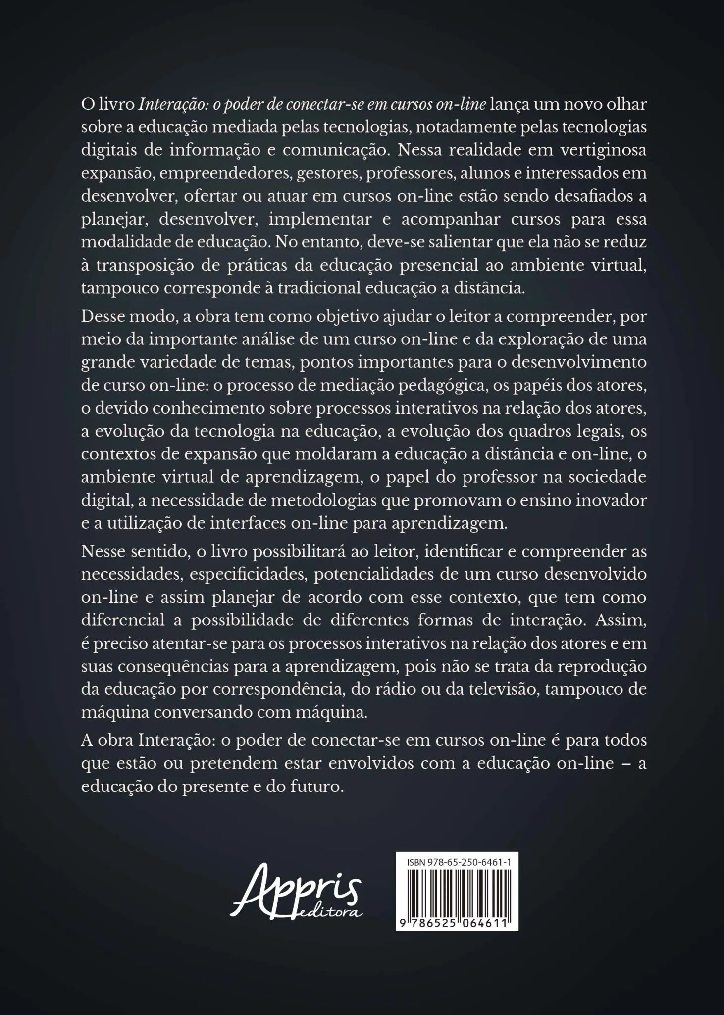 O livro Interação: o poder de conectar-se em cursos on-line lança um novo olhar sobre a educação mediada pelas tecnologias, notadamente pelas tecnologias digitais de informação e comunicação. Nessa realidade em vertiginosa expansão, empreendedores, gestores, professores, alunos e interessados em desenvolver, ofertar ou atuar em cursos on-line estão sendo desafiados a planejar, desenvolver, implementar e acompanhar cursos para essa modalidade de educação. No entanto, deve-se salientar que ela não se reduz à transposição de práticas da educação presencial ao ambiente virtual, tampouco corresponde à tradicional educação a distância.