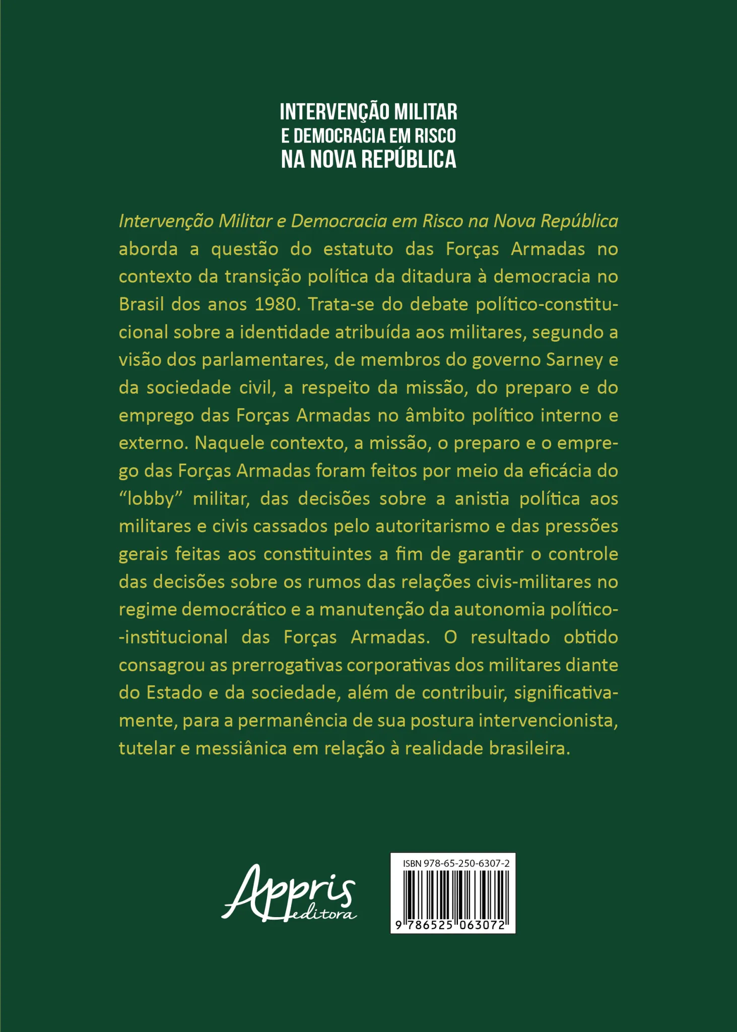 Intervenção Militar e Democracia em Risco na Nova República aborda a questão do estatuto das Forças Armadas no contexto da transição política da ditadura à democracia no Brasil dos anos 1980. Trata-se do debate político-constitucional sobre a identidade atribuída aos militares, segundo a visão dos parlamentares, de membros do governo Sarney e da sociedade civil, a respeito da missão, do preparo e do emprego das Forças Armadas no âmbito político interno e externo. Naquele contexto, a missão, o preparo e o emprego das Forças Armadas foram feitos por meio da eficácia do “lobby” militar, das decisões sobre a anistia política aos militares e civis cassados pelo autoritarismo e das pressões gerais feitas aos constituintes a fim de garantir o controle das decisões sobre os rumos das relações civis-militares no regime democrático e a manutenção da autonomia político-institucional das Forças Armadas. O resultado obtido consagrou as prerrogativas corporativas dos militares diante do Estado e da sociedade, além de contribuir, significativamente, para a permanência de sua postura intervencionista, tutelar e messiânica em relação à realidade brasileira.