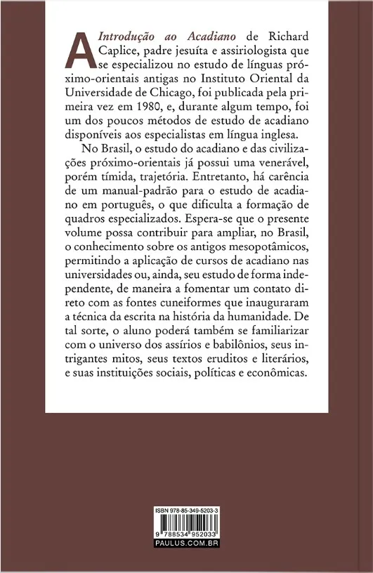 A Introdução ao Acadiano de Richard Caplice, padre jesuíta e assiriologista que se especializou no estudo de línguas próximo-orientais antigas no Instituto Oriental da Universidade de Chicago, foi publicada pela primeira vez em 1980, e, durante algum tempo, foi um dos poucos métodos de estudo de acadiano disponíveis aos especialistas em língua inglesa. No Brasil, o estudo do acadiano e das civilizações próximo-orientais carece de um manual padrão de estudo de acadiano em português, o que dificulta a formação de quadros especializados. Espera-se que o presente volume possa contribuir para ampliar, no Brasil, o conhecimento sobre os antigos mesopotâmicos, permitindo a aplicação de cursos de acadiano nas universidades ou, ainda, seu estudo de forma independente, de maneira a fomentar um contato direto com as fontes cuneiformes que inauguraram a técnica da escrita na história da humanidade. A Introdução ao Acadiano familiariza o estudante com símbolos cuneiformes desde a primeira lição, e conta com exercícios em todas as lições.