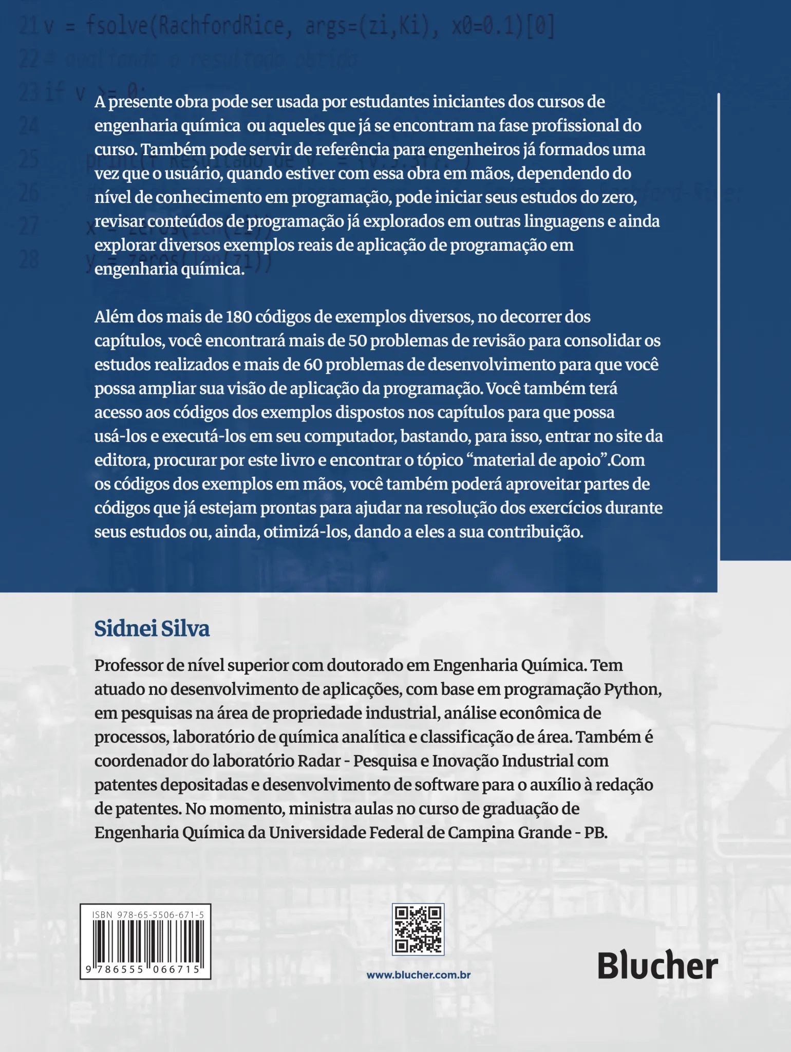 A presente obra pode ser usada por estudantes iniciantes dos cursos de engenharia química, por estudantes que já se encontram na fase profissional do curso e também para engenheiros já formados uma vez que o usuário, quando estiver com essa obra em mãos, dependendo do nível de conhecimento em programação, pode iniciar seis estudos do zero, revisar conteúdos de programação já explorados em outras linguagens e ainda explorar diversos exemplos reais de aplicação de programação em engenharia química.