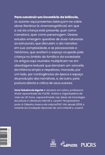 Para construir um inventário da infância, os autores aqui presentes debruçam-se sobre obras literárias (e cinematográficas) em que a voz da criança está presente, quer como narradora, quer como personagem. Desses estudos emergem questões de duas naturezas: as estruturais, que discutem o ato narrativo em sua complexidade, e as psicossociais e históricas, que avaliam o espaço ocupado pela criança no âmbito da família e da sociedade. Os artigos aqui reunidos multiplicam-se em abordagens textuais que denotam um conceito de infância amplo e respeitoso, marcado, por um lado, por contingências de época e espaço de produção das narrativas, e, de outro, pela postura atenta e crítica de seus autores. Vera Teixeira de Aguiar, doutora em Letras e autora de mais de 30 livros.