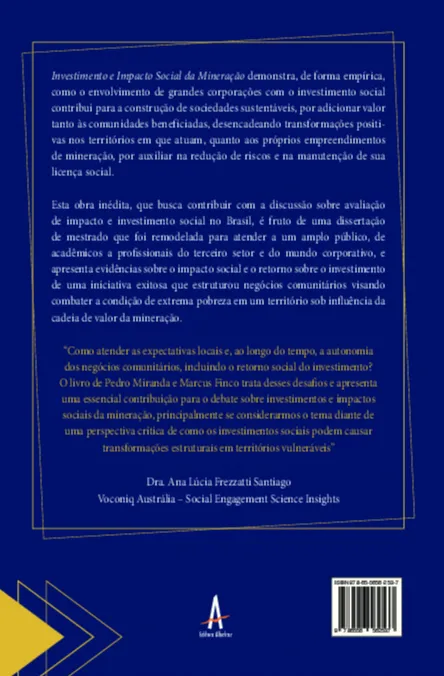 “Como atender as expectativas locais e, ao longo do tempo, a autonomia dos negócios comunitários, incluindo o retorno social do investimento? O livro de Pedro Miranda e Marcus Finco trata desses desafios e apresenta uma essencial contribuição para o debate sobre investimentos e impactos sociais da mineração, principalmente se considerarmos o tema diante de uma perspectiva crítica de como os investimentos sociais podem causar transformações estruturais em territórios vulneráveis” Dra. Ana Lúcia Frezzatti Santiago Voconiq Austrália – Social Engagement Science Insights