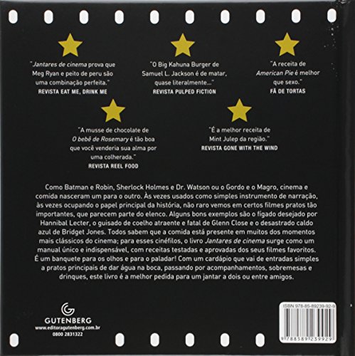 Como Batman e Robin, Sherlock Holmes e Dr. Watson ou o Gordo e o Magro, cinema e comida nasceram um para o outro. Às vezes usados como simples instrumento de narração, às vezes ocupando o papel principal da história, não raro vemos em certos filmes pratos tão importantes, que parecem parte do elenco. Alguns bons exemplos são o fígado desejado por Hannibal Lecter, o guisado de coelho atraente e fatal de Glenn Close e o desastrado caldo azul de Bridget Jones. Todos sabem que a comida está presente em muitos dos momentos mais clássicos do cinema; para esses cinéfilos, o livro Jantares de cinema surge como um manual único e indispensável, com receitas testadas e aprovadas dos seus filmes favoritos. É um banquete para os olhos e para o paladar! Com um cardápio que vai de entradas simples a pratos principais de dar água na boca, passando por acompanhamentos, sobremesas e drinques, este livro é a melhor pedida para um jantar a dois ou entre amigos.