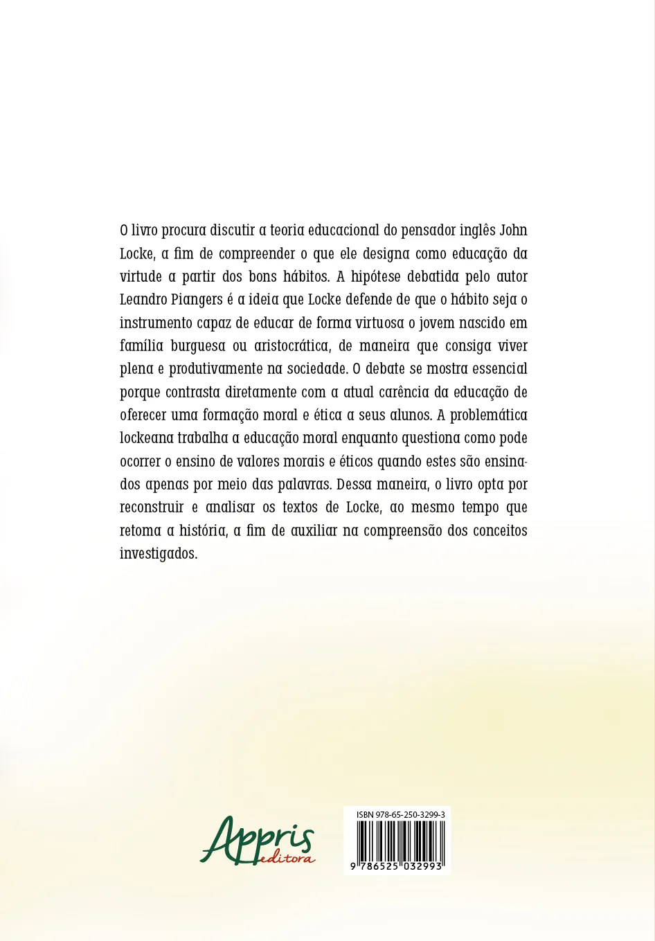 O livro procura discutir a teoria educacional do pensador inglês John Locke, a fim de compreender o que ele designa como educação da virtude a partir dos bons hábitos. A hipótese debatida pelo autor Leandro Piangers é a ideia que Locke defende de que o hábito seja o instrumento capaz de educar de forma virtuosa o jovem nascido em família burguesa ou aristocrática, de maneira que consiga viver plena e produtivamente na sociedade. O debate se mostra essencial porque contrasta diretamente com a atual carência da educação de oferecer uma formação moral e ética a seus alunos. A problemática lockeana trabalha a educação moral enquanto questiona como pode ocorrer o ensino de valores morais e éticos quando estes são ensinados apenas por meio das palavras. Dessa maneira, o livro opta por reconstruir e analisar os textos de Locke, ao mesmo tempo que retoma a história, a fim de auxiliar na compreensão dos conceitos investigados.