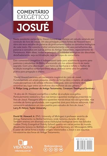 Neste excelente comentário, David Howard nos oferece um estudo versículo por versículo do livro de Josué. Um dos principais pontos fortes de Howard nesta obra são seus estudos de palavras de praticamente todos os conceitos teológicos de cada texto. Ele conecta o leitor constantemente com usos semelhantes das palavras e conceitos em outras partes do Antigo Testamento, especialmente do Pentateuco. Além disso, todas as principais dificuldades teológicas são discutidas detalhadamente, seja na introdução, seja no corpo do comentário.