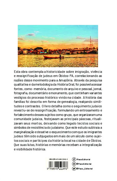 Esta obra contempla a historicidade sobre imigração, vivência e ressignificação de judeus em Óbidos-PA, correlacionando as razões desse movimento para a Amazônia. Através da pesquisa qualitativa e da metodologia da História Oral, foi possível acessar fontes, como: memória, documento de arquivo e pessoal, jornal, fotografia, documentário e monumento, que continham variantes vestígios do processo histórico vivido na cidade. A história das famílias foi descrita em forma de genealogia, realçando similitudes e contrastes. O livro detalha como o seguimento judaico revestiu-se de ressignificação, formulando um entrosamento e fortalecimento desses sujeitos como grupo, que organizaram uma comunidade judaica, festejavam as principais páscoas, ritualizavam seus mortos, deixando como legado tecidos sociais e símbolos de resistência do judaísmo.
