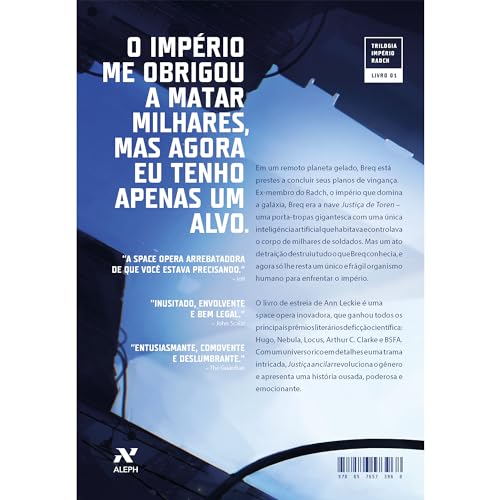 O IMPÉRIO ME OBRIGOU A MATAR MILHARES MAS AGORA EU TENHO APENAS UM ALVO. Em um remoto planeta gelado, Breq está prestes a concluir seus planos de vingança. Ex-membro do Radch, o império que domina a galáxia, Breq era a nave Justiça de Toren – uma porta-tropas gigantesca com uma única inteligência artificial que habitava e controlava o corpo de milhares de soldados. Mas um ato de traição destruiu tudo o que Breq conhecia, e agora só lhe resta um único e frágil organismo humano para enfrentar o império. O livro de estreia de Ann Leckie é uma space opera inovadora, que ganhou todos os principais prêmios literários de ficção científica: Hugo, Nebula, Locus, Arthur C. Clarke e BSFA. Com um universo rico em detalhes e uma trama intricada, Justiça ancilar revoluciona o gênero e apresenta uma história ousada, poderosa e emocionante.