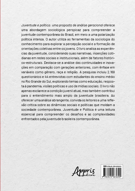 Juventude e política: uma proposta de análise geracional oferece uma abordagem sociológica perspicaz para compreender a juventude contemporânea do Brasil, em meio a uma polarização política intensa. O autor utiliza as ferramentas da sociologia do conhecimento para explorar a percepção social e a formação de orientações coletivas entre os jovens. O livro analisa as experiências da juventude, considerando suas narrativas, inserções cotidianas em redes sociais e institucionais, além de fatores histórico-estruturais. Destaca-se a análise das continuidades e inovações em comparação com gerações anteriores, com ênfase em variáveis como gênero, raça e religião. A pesquisa incluiu 2.169 questionários e 44 entrevistas com estudantes do ensino médio no Rio Grande do Sul, explorando temas como educação, resposta à pandemia, visões políticas e uso de mídias sociais. O livro não apenas esclarece a condição juvenil atual, mas também contribui para o entendimento mais amplo da juventude brasileira. Ao oferecer uma análise abrangente, convida os leitores a uma reflexão crítica sobre as dinâmicas sociais e políticas que moldam a sociedade contemporânea. Juventude e Política é uma leitura essencial para compreender os desafios e as complexidades enfrentados pela juventude brasileira contemporânea.
