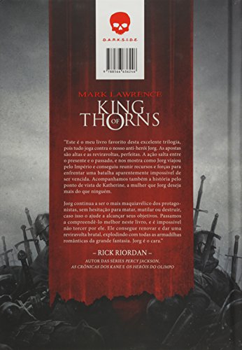 KING OF THORNS, DE MARK LAWRENCE.NINGUÉM MELHOR PARA FALAR DA ACLAMADA TRILOGIA DOS ESPINHOS DO QUE RICK RIORDAN, O AUTOR DA SÉRIE PERCY JACKSON.”Este é o meu livro favorito desta excelente trilogia, pois tudo joga contra o nosso anti-herói Jorg. As apostas são altas e as reviravoltas, perfeitas. Depois de assassinar seu tio e garantir um pequeno reino nas montanhas, o jovem Jorg agora encara um inimigo carismático e poderoso – o Princípe de Arrow –, que parece destinado a reunir o Império Destruído. A ação salta entre o presente e o passado, e nos mostra como Jorg viajou pelo império e conseguiu reunir recursos e forças para enfrentar uma batalha aparentemente impossível de ser vencida. Acompanhamos também a história pelo ponto de vista de Katherine, a mulher que Jorg deseja mais do que ninguém, e que ele está destinado a não conquistar jamais.Apesar de Jorg continuar a ser o mais maquiavélico dos protagonistas, sem hesitação para matar, mutilar ou destruir, caso isso o ajude a alcançar seus objetivos, passamos a compreendê-lo melhor neste livro, e é impossível não torcer por ele. Ele consegue renovar e dar uma reviravolta brutal, explodindo com todas as armadilhas românticas da grande fantasia – lealdade, honra, o bem contra mal e a fé em um causa maior. Às vezes, quando você vê aquele cavaleiro branco em seu cavalo, com uma armadura reluzente e um sorriso brilhante, só quer atirá-lo no chão e dar-lhe um murro na cara dele por ser tão perfeito. Se você já teve essa sensação algum vez, Jorg é o cara.[…]”O UNIVERSO DA FANTASIA DE CARA NOVACom citações de Shakespeare e Nietzsche, e referências que vão de Game of Thrones a Quentin Tarantino, a Trilogia dos Espinhos é muito mais do que uma saga medieval. A narrativa afiada de Mark Lawrence brinda o leitor com personagens maquiavélicos, seres sobrenaturais, toques de humor negro e uma trama surpreendente que se passa num mundo abandonado pelos enigmáticos Construtores.É mesmo impossível não torcer pela vitória do príncipe, ainda que nem o mais insensível dos leitores tenha coragem de considerá-lo um herói. Jorg Ancrath faz o que for preciso para conquistar seus objetivos.“É como um acidente de trem, você não consegue desviar os olhos do livro”, comparou Terry Brooks, autor da versão romantizada de “Star Wars Espisódio 1, A Ameaça Fantasma”. Já Robin Hobb, autora do best-seller “Aprendiz de Assassino”, chamou o livro de “sombrio e implacável”, e se sentiu tão apegada à história que confessou: “Duas da manhã e eu continuo virando as páginas.”Já estava na hora de continuarmos a caminhada ao lado de Jorg Ancrath e seu rastro de sangue.