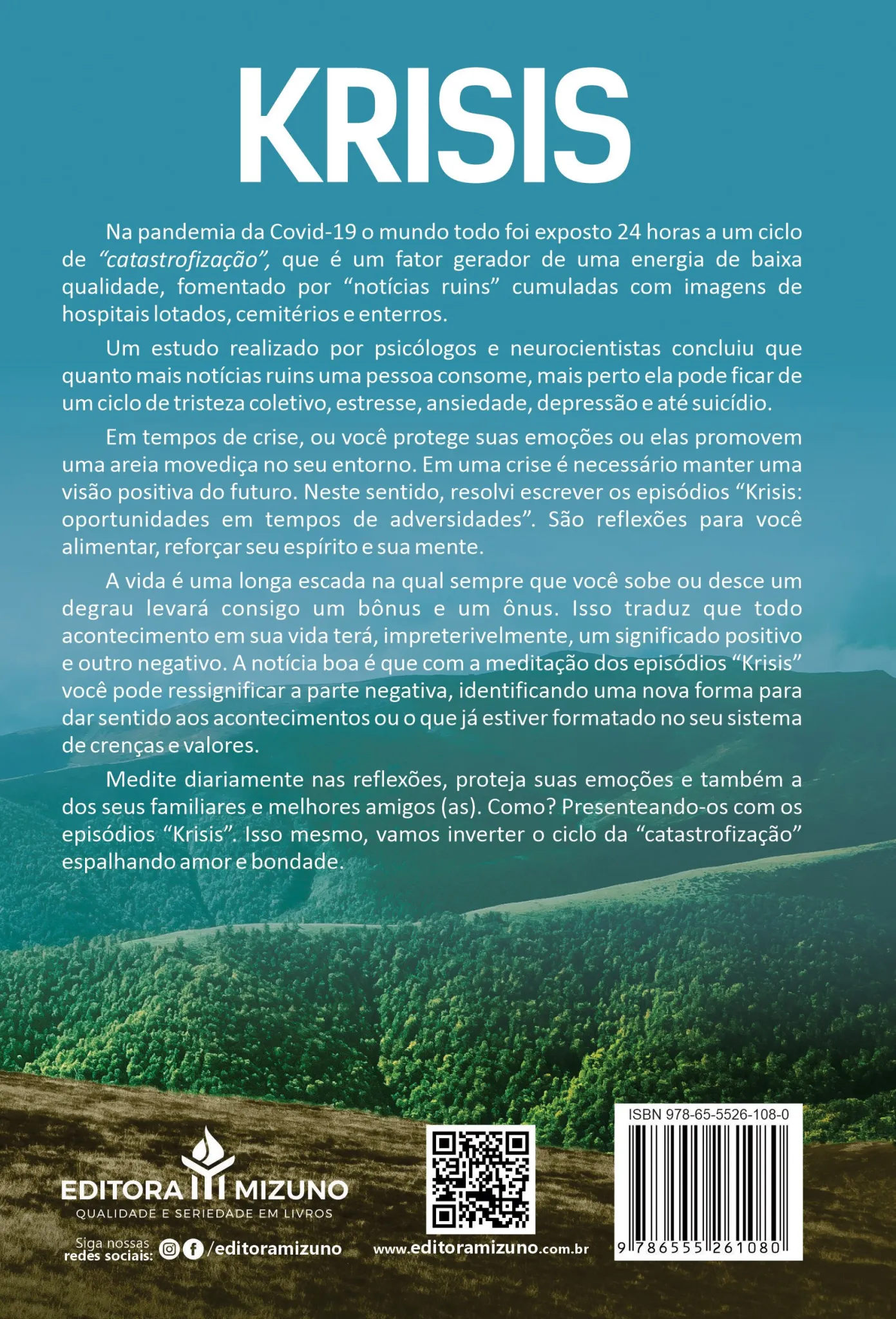 Na pandemia da Covid-19 o mundo todo foi exposto 24 horas a um ciclo de “catastrofização”, que é um fator gerador de uma energia de baixa qualidade, fomentado por “notícias ruins” cumuladas com imagens de hospitais lotados, cemitérios e enterros. Um estudo realizado por psicólogos e neurocientistas concluiu que quanto mais notícias ruins uma pessoa consome, mais perto ela pode ficar de um ciclo de tristeza coletivo, estresse, ansiedade, depressão e até suicídio. Em tempos de crise, ou você protege suas emoções ou elas promovem uma areia movediça no seu entorno. Em uma crise é necessário manter uma visão positiva do futuro. Neste sentido, resolvi escrever os episódios “Krisis: oportunidades em tempos de adversidades”. São reflexões para você alimentar, reforçar seu espírito e sua mente. A vida é uma longa escada na qual sempre que você sobe ou desce um degrau levará consigo um bônus e um ônus. Isso traduz que todo acontecimento em sua vida terá, impreterivelmente, um significado positivo e outro negativo. A notícia boa é que com a meditação dos episódios “Krisis” você pode ressignificar a parte negativa, identificando uma nova forma para dar sentido aos acontecimentos ou o que já estiver formatado no seu sistema de crenças e valores. Medite diariamente nas reflexões, proteja suas emoções e também a dos seus familiares e melhores amigos (as). Como? Presenteando-os com os episódios “Krisis”. Isso mesmo, vamos inverter o ciclo da “catastrofização” espalhando amor e bondade.