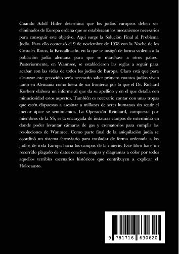 Cuando Adolf Hitler determina que los judíos europeos deben ser eliminados de Europa ordena que se establezcan los mecanismos necesarios para conseguir este objetivo. Aquí surge la Solución Final al Problema Judío. Para ello comenzó el 9 de noviembre de 1938 con la Noche de los Cristales Rotos, la Kristallnacht, en la que se instigó de forma violenta a la población judía alemana para que se marchase a otros países. Posteriormente, en Wannsee, se establecieron las reglas a seguir para acabar con las vidas de todos los judíos de Europa. Claro está que para alcanzar este genocidio sería necesario saber primero cuantos judíos viven tanto en Alemania como fuera de sus fronteras por lo que el Dr. Richard Korherr elabora un informe al que da su apellido y en el que detalla con minuciosidad estos aspectos. También es necesario contar con unas tropas que estén dispuestas a asesinar a millones de seres humanos sin sentir el menor ápice se sentimientos. La Operación Reinhard, compuesta por miembros de la SS, es la encargada de instaurar campos de exterminio en donde poder levantar cámaras de gas y crematorios para cumplir las resoluciones de Wannsee. Como parte final de la aniquilación judía se coordinó un sistema ferroviario para trasladar de forma ordenada a los judíos de toda Europa hacia los campos de la muerte. Este libro hace un recorrido plagado de datos concisos, mapas y diagramas a color por todos aquellos terribles escenarios históricos que contribuyen a explicar el Holocausto.