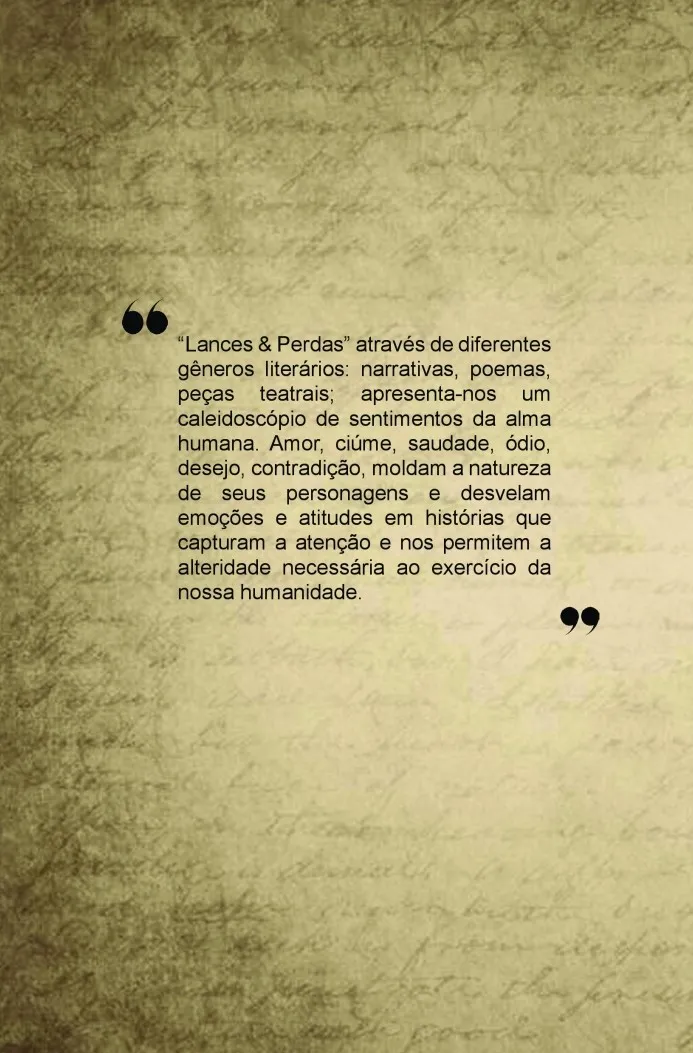 “Lances & Perdas” é um livro que exibe para o leitor questões humanas aprofundadas nas várias relações entre as personagens: solidão, desejos, afetos, fé, conveniência, amor, sexo, vida. Tudo em lances, rápidos, efêmeros, dissolúveis. As personagens vivenciam conflitos e prazeres em pequenos lances e, muitas vezes, perdas. Mas o que é posto em xeque é a visão que cada um tem de si, a partir dos lugares de afeto que ocupam na sua e na vida dos outros. O conceito de produtividade guia as relações das personagens. Contos, narrativas, dramaturgia contemporânea, escrita poemática, eis o que o leitor encontrará em “Lances & Perdas”.
