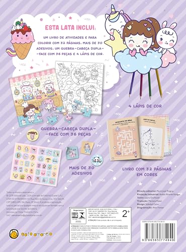 Um livro do universo Kawaii com atividades e imagens para colorir. Inclui mais de 30 adesivos, um quebra-cabeça dupla-face com 36 peças e 4 lápis de cor. Tudo isso em uma linda lata. Presente inesquecível. A partir de 4 anos.