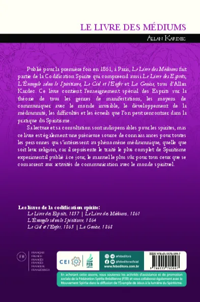 Publié pour la première fois en 1861, à Paris, Le Livre des Médiums fait partie de la Codification Spirite qui compreend aussi Le Livre des Esprits, L’Évangile selon le Spiritisme, Le Ciel et l’Enfer et La Genèse, tous d’Allan Kardec. Ce livre contient l’enseignement spécial des Esprits sur la théorie de tous les genres de manifestations, les moyens de communiquer avec le monde invisible, le développement de la médiumnité, les difficultés et les écueils que l’on peut rencontrer dans la pratique du Spiritisme. Sa lecture et sa consultation sont indispensables pour les spirites, mas ce livre est également une précieuse source de connaissances pour toutes les personnes qui s’intéressent au phénomène médiumnique, quelle que soit leur religion, car il représente le traité le plus complet de Spiritisme experimental publié à ce jour, le manuel le plus sûr pour tous ceux que se consacrent aux activités de communication avec le monde spirituel.