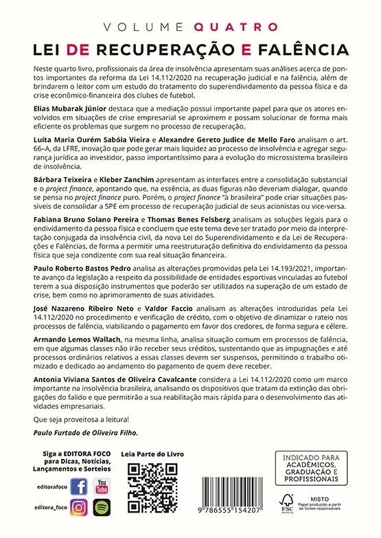 Neste quarto livro, profissionais da área de insolvência apresentam suas análises acerca de pontos importantes da reforma da Lei 14.112/2020 na recuperação judicial e na falência, além de brindarem o leitor com um estudo do tratamento do superendividamento da pessoa física e da crise econômico-financeira dos clubes de futebol.