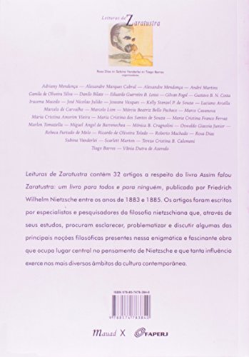 Leituras de Zaratustra contém 32 capítulos a respeito do livro Assim falou Zaratustra: um livro para todos e para ninguém, publicado por Friedrich Wilhelm Nietzsche entre os anos de 1883 e 1885. Os capítulos foram escritos por especialistas e pesquisadores da filosofia nietzschiana que, através de seus estudos, procuram esclarecer, problematizar e discutir algumas das principais noções filosóficas presentes nessa enigmática e fascinante obra que ocupa lugar central no pensamento de Nietzsche e que tanta influência exerce nos mais diversos mbitos da cultura contemporânea.