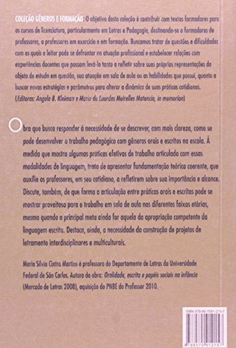 Obra que busca responder à necessidade de se descrever, com mais clareza, como se pode desenvolver o trabalho pedagógico com gêneros orais e escritos na escola. À medida que mostra algumas práticas efetivas de trabalho articulado com essas modalidades de linguagem, trata de apresentar fundamentação teórica coerente, que auxilie os professores, em seu cotidiano, a refletirem sobre sua importância e alcance. Discute, também, de que forma a articulação entre práticas orais e escritas pode se mostrar proveitosa para o trabalho em sala de aula nas diferentes faixas etárias, mesmo quando a principal meta ainda for aquela da apropriação competente da linguagem escrita. Destaca, ainda, a necessidade da construção de projetos de letramento interdisciplinares e multiculturais.