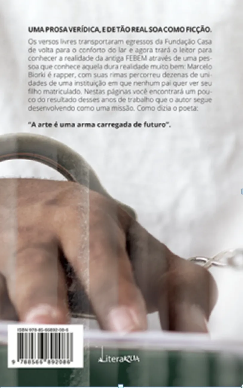 Uma prosa verídica, e de tão real soa como ficção. Os versos livres transportaram egressos da Fundação Casa de volta para o conforto do lar e agora trará o leitor para conhecer a realidade da antiga FEBEM através de uma pessoa que conhece aquela dura realidade muito bem: Marcelo Biorki é rapper, com suas rimas percorreu dezenas de unidades de uma instituição em que nenhum pai quer ver seu filho matriculado. Nas páginas deste livro você encontrará um pouco do resultado desses anos de trabalho que o autor segue desenvolvendo como uma missão. Como dizia o poeta: “A arte é uma arma carregada de futuro”. Sobre o autor: Marcelo Biorki do Espirito Santo nasceu no interior de São Paulo em 1980. Rapper, fundador do grupo Shekinah Rap, integrante da banda DigitalBomb, arte educador e um sonhador nato. Viu na música uma ferramenta de lapidação do ser humano e motivado pelas próprias experiências de vida iniciou em 2010 um projeto voluntário na Fundação CASA, por onde percorreu 22 unidades espalhadas em 16 cidades do Estado. Falou, deu conselhos, se emocionou, ensinou, aprendeu e versou com milhares de adolescentes desprovido de liberdade. Agora compartilha esta experiência em sua primeira publicação.