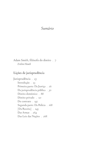 “Se considerarmos o percurso intelectual de Adam Smith, desde os cursos ministrados em Edimburgo até a publicação de A riqueza das nações, as Lições de jurisprudência ocupam uma posição mediadora importante não apenas por apresentarem, de forma inédita, os contornos de sua concepção sobre justiça e governo, mas também por oferecerem elementos para se analisar o desenvolvimento de suas ideias econômicas e avaliar a influência que a Fisiocracia exerceu sobre sua obra.”