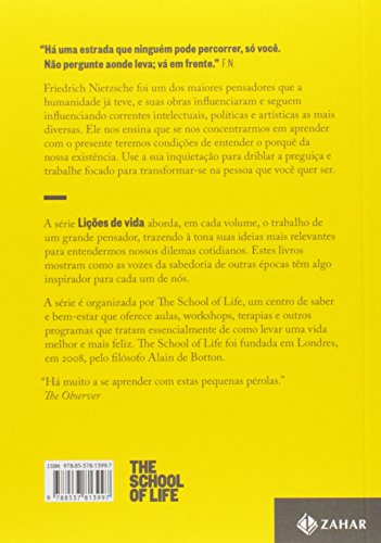 A série Lições de vida aborda, em cada volume, o trabalho de um grande pensador, trazendo à tona suas ideias mais relevantes para entendermos nossos dilemas cotidianos. “Há uma estrada que ninguém pode percorrer, só você. Não pergunte aonde leva; vá em frente.” Friedrich Nietzsche Nietzsche foi um dos maiores pensadores que a humanidade já teve, e suas obras influenciaram e seguem influenciando correntes intelectuais, políticas e artísticas as mais diversas. Ele ensina que se nos concentrarmos em aprender com o presente teremos condições de entender o porquê da nossa existência. Use a sua inquietação para driblar a preguiça e trabalhe focado para transformar-se na pessoa que você quer ser. Organizados pela The School of Life, um centro de saber e bem-estar fundado em Londres por Alain de Botton, esses livros mostram como as vozes da sabedoria de outras épocas têm algo inspirador para cada um de nós. “Há muito a se aprender com essas pequenas pérolas.” The Observer