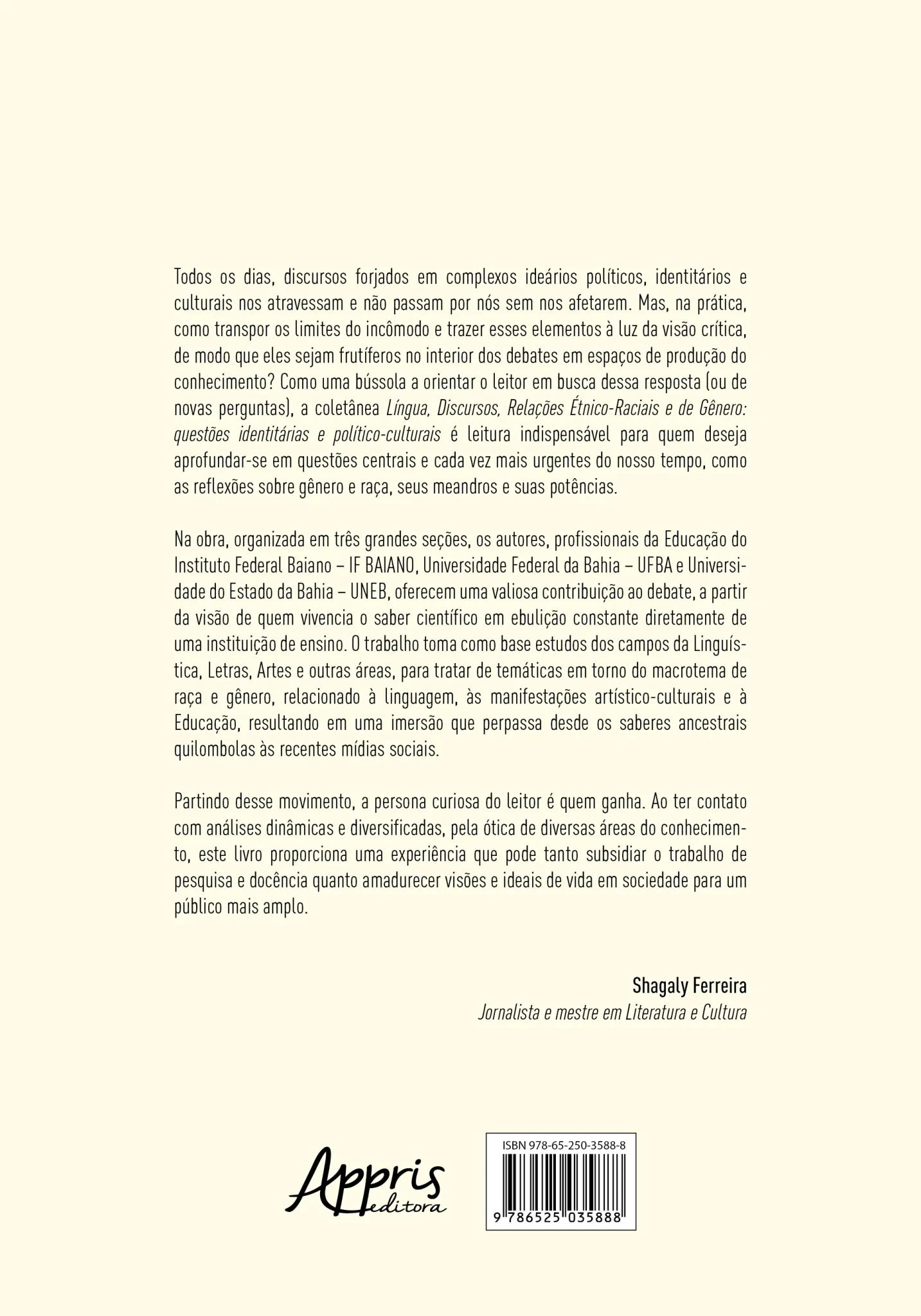 Na obra, organizada em três grandes seções, os autores, profissionais da Educação do Instituto Federal Baiano – IF BAIANO, Universidade Federal da Bahia – UFBA e Universidade do Estado da Bahia – UNEB, oferecem uma valiosa contribuição ao debate, a partir da visão de quem vivencia o saber científico em ebulição constante diretamente de uma instituição de ensino. O trabalho toma como base estudos dos campos da Linguística, Letras, Artes e outras áreas, para tratar de temáticas em torno do macrotema de raça e gênero, relacionado à linguagem, às manifestações artístico-culturais e à Educação, resultando em uma imersão que perpassa desde os saberes ancestrais quilombolas às recentes mídias sociais.