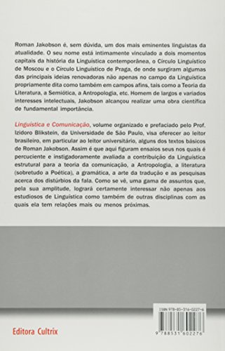 “Linguística e Comunicação”, volume organizado e prefaciado pelo Prof. Izidoro Blikstein, da Universidade de São Paulo, visa oferecer ao leitor brasileiro, em particular ao leitor universitário, alguns dos textos básicos de Roman Jakobson. Assim é que aqui figuram ensaios seus nos quais é percuciente e instigadoramente avaliada a contribuição da Linguística estrutural para a teoria da comunicação, a antropologia, a literatura (sobretudo a poética), a gramática, a arte da tradução e as pesquisas acerca dos distúrbios da fala. Como se vê, uma gama de assuntos que, pela sua amplitude, logrará certamente interessar não apenas aos estudiosos de Linguística como também de outras disciplinas com as quais ela tem relações mais ou menos próximas.