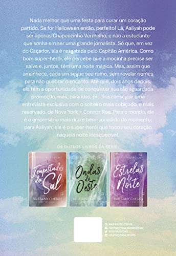 “No Halloween, Chapeuzinho Vermelho é resgatada por quem menos esperava, o Capitão América. Mas num acordo ao fim da noite, os dois decidem se separar, deixando o destino a cargo de uni-los novamente, se for para ser. E o destino tem seus caprichos… Luzes do Leste é o segundo livro da emocionante série Bússola, de Brittainy Cherry. É noite de Halloween em Nova York, e Chapeuzinho Vermelho, que acabou de descobrir que estava sendo traída pelo namorado, resolve curar as mágoas numa festa com uma amiga. Mas logo se vê sozinha naquele mar de gente e é resgatada pelo Capitão América. O cara tem talento para super-herói: parece se importar mais com os outros do que com ele mesmo e percebe que Chapeuzinho precisa de uma forcinha. Juntos, os dois vivem experiências inesquecíveis em vários pontos da cidade. Mas é em um terraço, sob as luzes do leste, que eles abrem o coração um para o outro – sem revelar seus nomes. Tudo o que Capitão sabe sobre Chapeuzinho é que ela foi abandonada pela mãe ainda bebê e que seu sonho é ter uma família e se tornar uma jornalista bem-sucedida. O que Chapeuzinho descobre sobre Capitão é que ele passou muitos anos acompanhando a mãe em consultas e tratamentos, até que um dia recebeu a notícia de que ela estava curada do câncer. Então jurou que ia trabalhar duro para vencer na vida e ajudar os menos favorecidos. Quando aquela noite mágica chega ao fim, os dois combinam de nunca mais voltar aos lugares aonde foram juntos, deixando que o universo os conecte de novo – se isso tiver de acontecer. Dois anos depois, Connor Roe deixou para trás a roupa de Capitão América e, aos 28 anos, é um dos homens mais ricos da cidade. Muito reservado, ele se recusa a dar entrevistas. Aaliyah Winters ainda tem sua fantasia de Chapeuzinho Vermelho, mas está focada na realidade. Ela é editora-assistente em uma grande revista e está de casamento marcado com Jason, um executivo bem-sucedido que acabou de ser transferido para a Califórnia. Para celebrar sua promoção, a empresa dá uma festa, na qual Aaliyah finalmente vai conhecer os colegas de trabalho do noivo. Ela só não imaginava que o sócio dele seria Connor Roe: o homem mais poderoso de Nova York e que tanto tocou seu coração naquela noite de Halloween. “