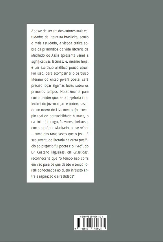 Nesse sentido, o livro apresenta várias novidades, algumas inéditas. Dentre elas, a história do primeiro mestre do jovem Machado, o poeta português Francisco Gonçalves Braga; o fim do mistério biográfico de sua passagem como revisor pelo Correio Mercantil; a história da primeira “tradução” poética; a leitura do poema inédito; a precoce consciência literária nos primeiros poemas e textos críticos; os diálogos literários com Álvares de Azevedo e a história do malogrado primeiro livro de poemas, O livro dos vinte anos . Enfim, espera-se que, de alguma forma, o presente livro possa contribuir para um entendimento, talvez mais orgânico, da obra literária de Machado de Assis.