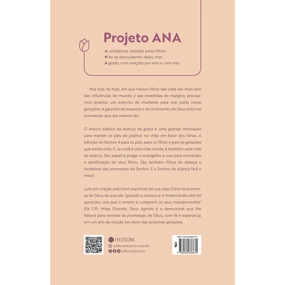 Lute em oração pelo bem espiritual de sua casa. Creia na promessa de Deus de que ele “guarda a aliança e a misericórdia até mil gerações aos que o amam e cumprem os seus mandamentos” (Dt 7.9). Mães Orando, Deus Agindo é o devocional que lhe faltava para revisitar as promessas de Deus, com fé e esperança, em um ano de oração em favor das próximas gerações.
