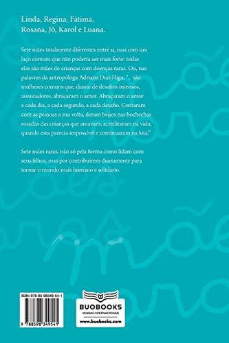 A partir do depoimento de sete mães de crianças com doenças raras, a autora Désirée Novaes – ela mesma portadora de uma das mais de 6 mil doenças consideradas raras – apresenta a história de sete mulheres de várias partes do Brasil que falam de força e amor, de medo e solidão, de crescimento pessoal e questionamentos. Sete mães raras, não só pela forma como lidam com seus filhos, mas por contribuírem diariamente para tornar o mundo mais humano e solidário.