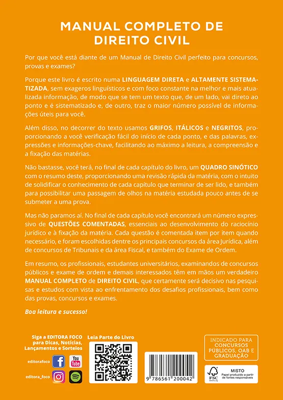 Em resumo, os profissionais, estudantes universitários, examinandos de concursos públicos e exame de ordem e demais interessados têm em mãos um verdadeiro MANUAL COMPLETO de DIREITO CIVIL, que certamente será decisivo nas pesquisas e estudos com vista ao enfrentamento dos desafios profissionais, bem como das provas, concursos e exames.