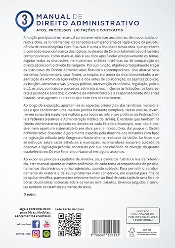 A função precípua de um manual consiste em oferecer aos leitores, de modo rápido, direito e claro, os fundamentos, os conceitos e um panorama da legislação e da jurisprudência de certa disciplina científica. Não é outra a finalidade desta obra, que apresenta o conteúdo essencial acerca dos tópicos nucleares do direito administrativo brasileiro contemporâneo. Como manual, não é seu foco aprofundar excessivamente os temas, esgotar todas as discussões, nem valorizar análises históricas ou de comparação do direito pátrio com o direito estrangeiro. Por sua função, objetiva principalmente traçar as estruturas do direito administrativo brasileiro contemporâneo. Isso abarca: seus conceitos fundamentais; suas fontes, princípios e a teoria da discricionariedade; a organização da Administração Pública e dos entes de colaboração; os agentes públicos; as funções administrativas (serviço público, intervenção econômica, regulação, polícia etc.); os atos, contratos e processos administrativos, inclusive as licitações; os bens estatais públicos e privados; o controle da Administração e a responsabilidade dos entes estatais, seus agentes e terceiros que com eles se relacionem.