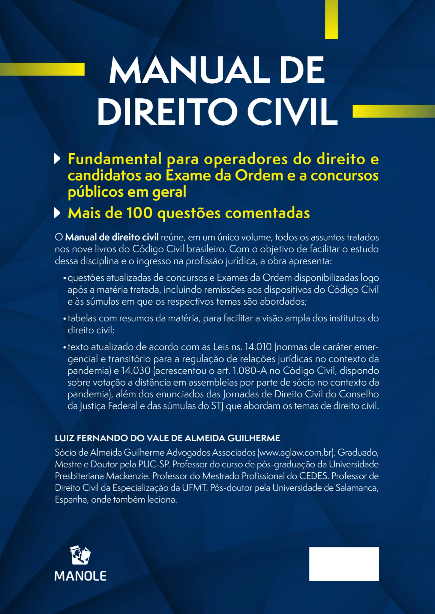 O Manual de Direito Civil reúne, em um único volume, todos os assuntos tratados nos nove livros do Código Civil brasileiro. Com o objetivo de facilitar o estudo dessa disciplina e o ingresso na profissão jurídica, a obra apresenta: