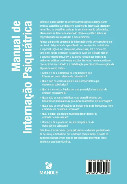 A internação psiquiátrica é o local onde frequentemente situações dramáticas e graves encontram uma oportunidade de mudança de trajetória e correção de rumos. É também um ambiente único, diferente dos cenários de atenção primária e ambulatórios especializados, onde o próprio ambiente é uma variável fundamental. Este livro cobre uma lacuna e oferece a colegas especialistas em saúde mental, professores, alunos de graduação da área da saúde, residentes em saúde mental e psiquiatria e profissionais de saúde mental em geral um compilado de conteúdos voltado a capacitar e esclarecer sobre patologias, situações e circunstâncias relacionadas à internação psiquiátrica. Trata-se de um guia prático e uma referência literária sobre o estado de arte da internação psiquiátrica, atualizando a literatura pertinente nas suas diversas seções.