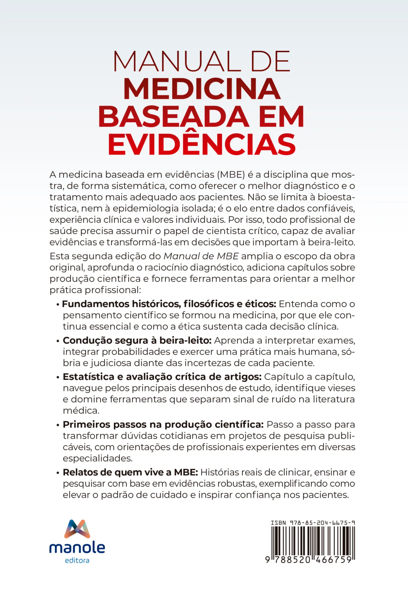 Esta segunda edição do Manual de MBE amplia o escopo da obra original: aprofunda o raciocínio diagnóstico, adiciona capítulos sobre produção científica e fornece ferramentas práticas para evitar armadilhas metodológicas. O resultado é um guia completo que fortalece a ética clínica, protege contra modismos e prepara o leitor para interpretar e gerar conhecimento de alta qualidade.
