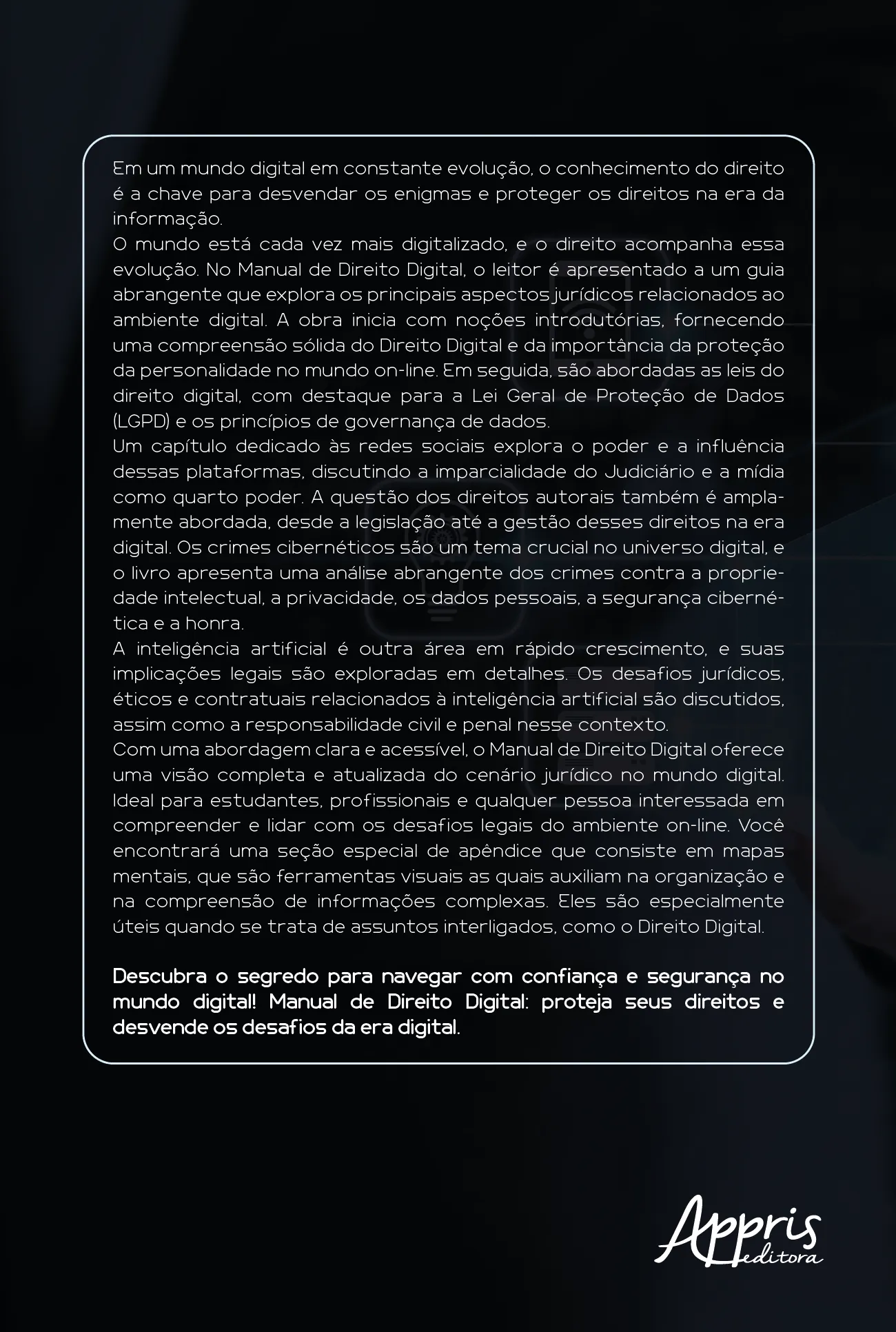 O mundo está cada vez mais digitalizado, e o direito acompanha essa evolução. No Manual de Direito Digital, o leitor é apresentado a um guia abrangente que explora os principais aspectos jurídicos relacionados ao ambiente digital. A obra inicia com noções introdutórias, fornecendo uma compreensão sólida do Direito Digital e da importância da proteção da personalidade no mundo on-line. Em seguida, são abordadas as leis do direito digital, com destaque para a Lei Geral de Proteção de Dados (LGPD) e os princípios de governança de dados.