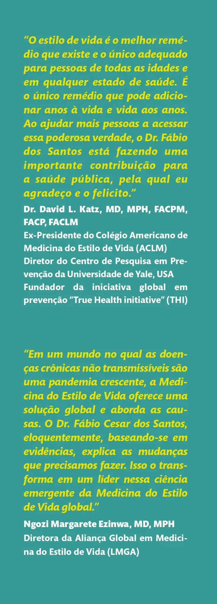 Desde sua formação, Dr. Fábio César dos Santos pratica uma visão Preventiva, Preditiva, Participativa e Personalizada da saúde, fazendo referência à Medicina P4 do mundo moderno. Tem como base de sua prática mudanças no estilo de vida (dieta e nutrientes, movimento e exercício, adequação de sono, controle de estresse, relacionamentos e interação com o meio ambiente) e a correção de desequilíbrios funcionais do organismo humano por meio de trabalho integrativo e multidisciplinar. Neste livro você aprenderá a fazer os ajustes metabólicos, hormonais, energéticos e inflamatórios que fazem parte desse programa que busca a promoção da saúde e reversão de doenças.
