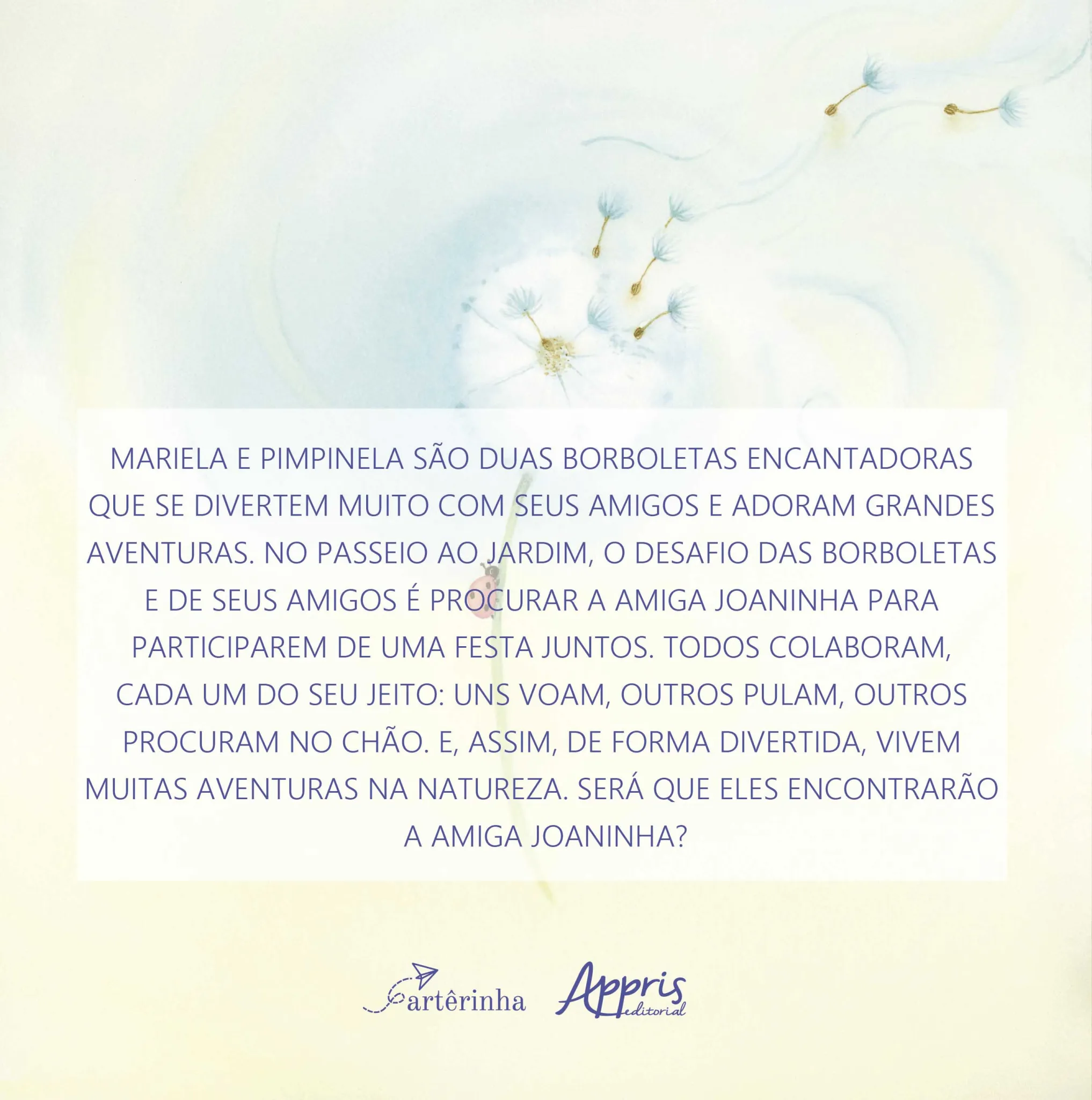 Mariela e Pimpinela são duas borboletas encantadoras que se divertem muito com seus amigos e adoram grandes aventuras. No passeio ao jardim, o desafio das borboletas e de seus amigos é procurar a amiga joaninha para participarem de uma festa juntos. Todos colaboram, cada um do seu jeito: uns voam, outros pulam, outros procuram no chão. E, assim, de forma divertida, vivem muitas aventuras na natureza. Será que eles encontrarão a amiga joaninha?