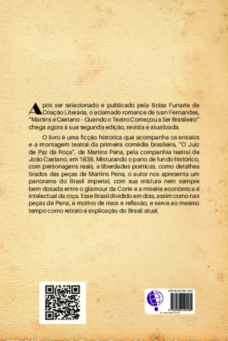 Ficção histórica que acompanha os ensaios e a montagem teatral da primeira comédia brasileira, “O Juiz de Paz da Roça”, de Martins Pena, pela companhia teatral de João Caetano, em 1838. Misturando o pano de fundo histórico, com personagens reais, as liberdades poéticas, como detalhes tirados das peças de Martins Pena, o autor nos apresenta um panorama do Brasil Imperial, com sua mistura nem sempre bem dosada entre o glamour da Corte e a miséria econômica e intelectual da roça. Esse Brasil dividido em dois, assim como nas peças de Pena, é motivo de risos e reflexão, e serve ao mesmo tempo como retrato e explicação do Brasil atual.