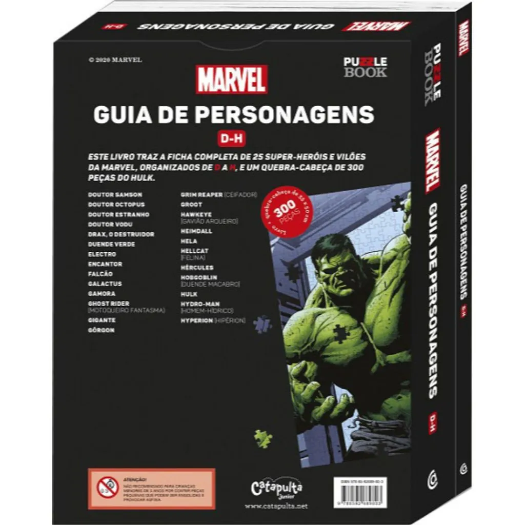 Cada livro inclui todos detalhes (poderes, aliados, rivais, curiosidades) de 25 heróis e vilões da Marvel e um quebra-cabeça de 300 peças.
