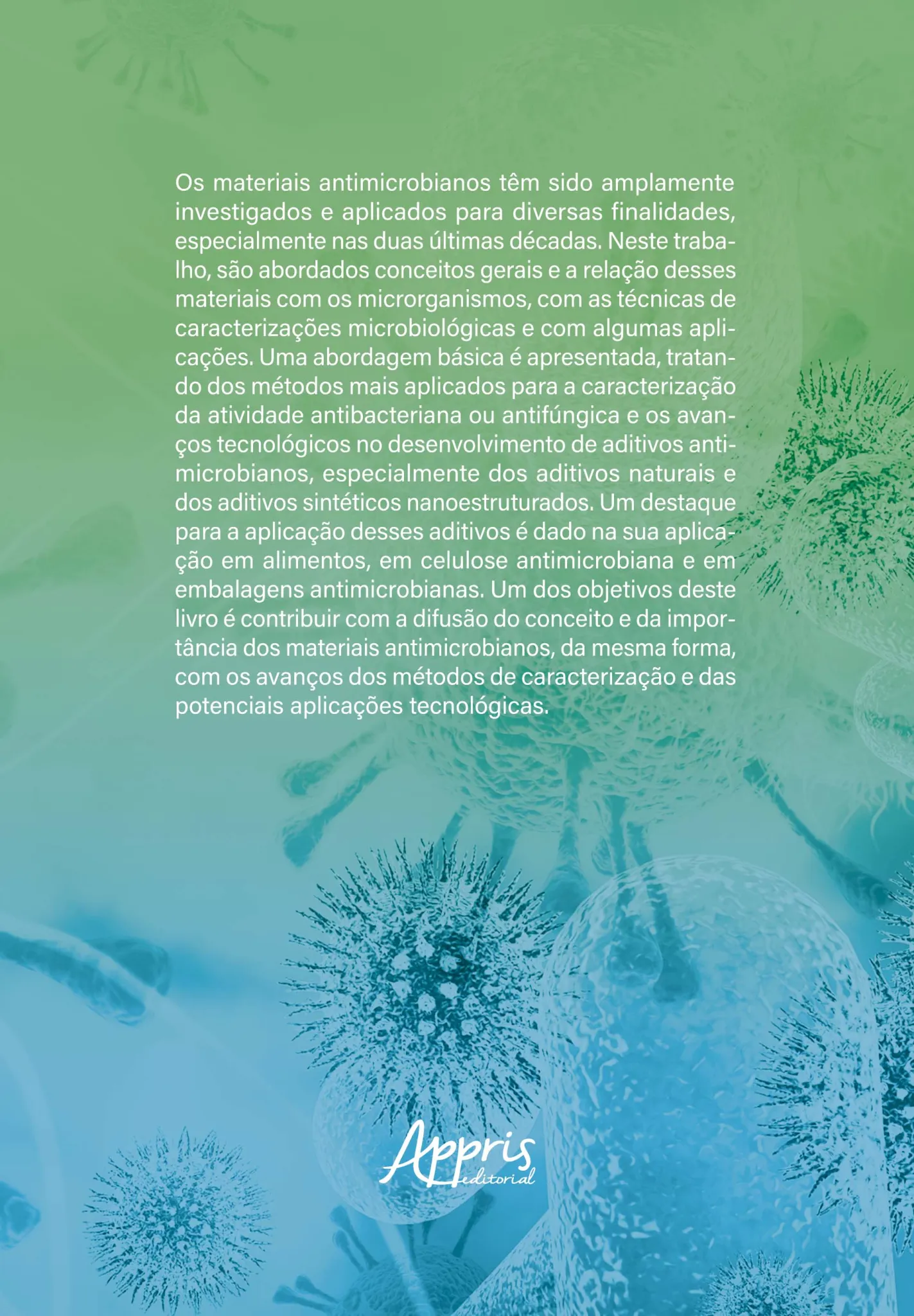 Os materiais antimicrobianos têm sido amplamente investigados e aplicados para diversas finalidades, especialmente nas duas últimas décadas. Neste trabalho, são abordados conceitos gerais e a relação desses materiais com os microrganismos, com as técnicas de caracterizações microbiológicas e com algumas aplicações. Uma abordagem básica é apresentada, tratando dos métodos mais aplicados para a caracterização da atividade antibacteriana ou antifúngica e os avanços tecnológicos no desenvolvimento de aditivos antimicrobianos, especialmente dos aditivos naturais e dos aditivos sintéticos nanoestruturados. Um destaque para a aplicação desses aditivos é dado na sua aplicação em alimentos, em celulose antimicrobiana e em embalagens antimicrobianas. Um dos objetivos deste livro é contribuir com a difusão do conceito e da importância dos materiais antimicrobianos, da mesma forma, com os avanços dos métodos de caracterização e das potenciais aplicações tecnológicas.