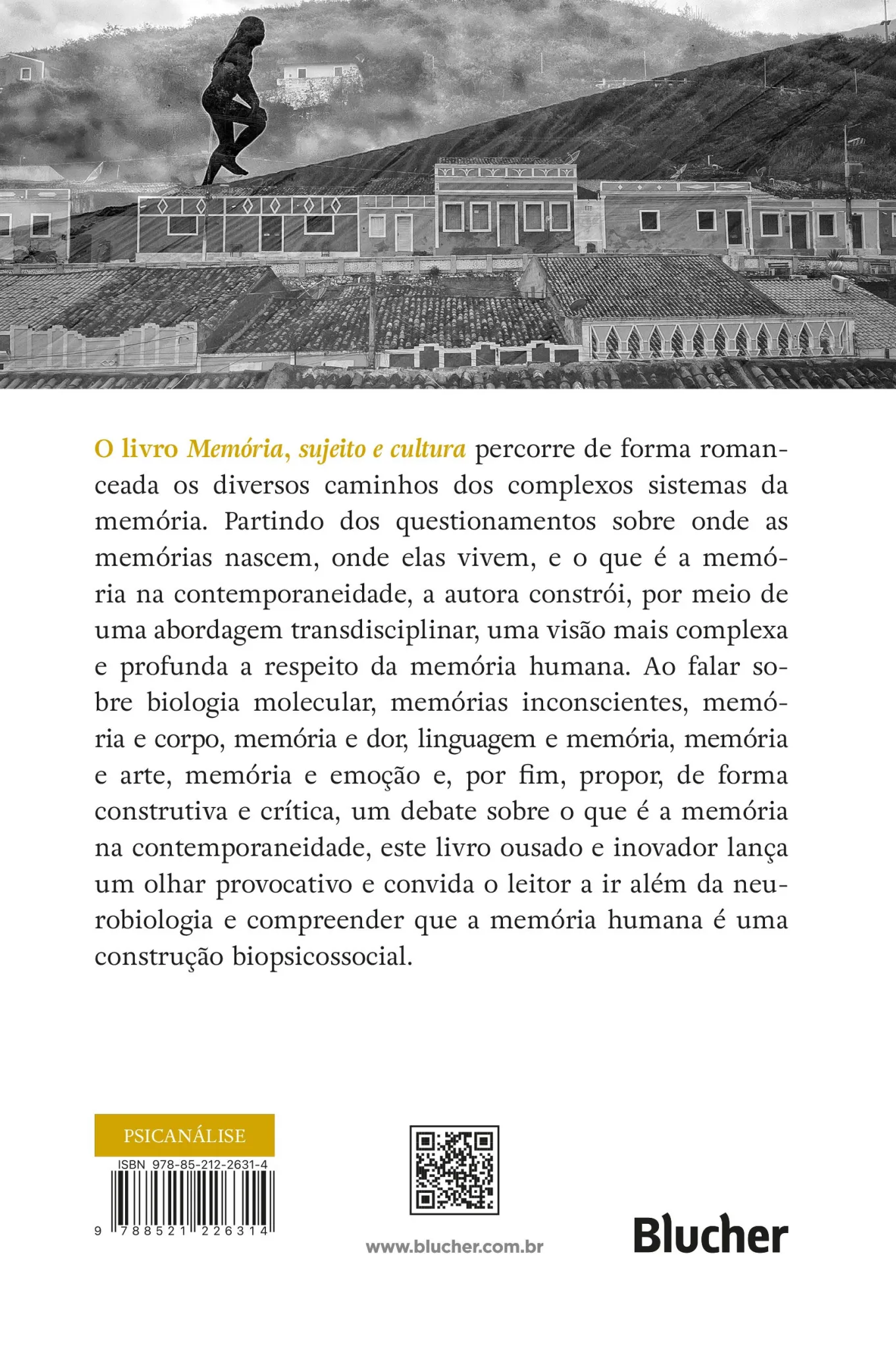 O livro Memória, sujeito e cultura percorre de forma romanceada os diversos caminhos dos complexos sistemas da memória. Partindo dos questionamentos sobre onde as memórias nascem, onde elas vivem, e o que é a memória na contemporaneidade, a autora constrói, por meio de uma abordagem transdisciplinar, uma visão mais complexa e profunda a respeito da memória humana. Ao falar sobre biologia molecular, memórias inconscientes, memória e corpo, memória e dor, linguagem e memória, memória e arte, memória e emoção e, por fim, propor, de forma construtiva e crítica, um debate sobre o que é a memória na contemporaneidade, este livro ousado e inovador lança um olhar provocativo e convida o leitor a ir além da neurobiologia e compreender que a memória humana é uma construção biopsicossocial.