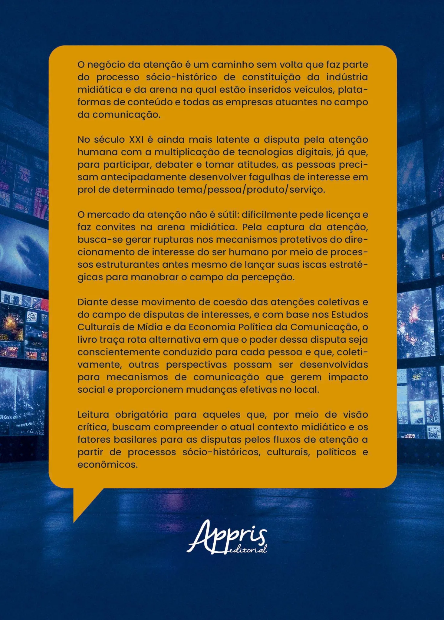 Diante desse movimento de coesão das atenções coletivas e do campo de disputas de interesses, e com base nos Estudos Culturais de Mídia e da Economia Política da Comunicação, o livro traça rota alternativa em que o poder dessa disputa seja conscientemente conduzido para cada pessoa e que, coletivamente, outras perspectivas possam ser desenvolvidas para mecanismos de comunicação que gerem impacto social e proporcionem mudanças efetivas no local.