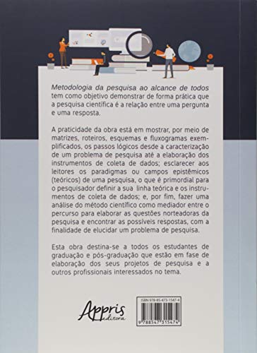 Metodologia da pesquisa ao alcance de todos tem como objetivo demonstrar de forma prática que a pesquisa científica é a relação entre uma pergunta e uma resposta. A praticidade da obra está em mostrar, por meio de matrizes, roteiros, esquemas e fluxogramas exemplificados, os passos lógicos desde a caracterização de um problema de pesquisa até a elaboração dos instrumentos de coleta de dados; esclarecer aos leitores os paradigmas ou campos epistêmicos (teóricos) de uma pesquisa, o que é primordial para o pesquisador definir a sua linha teórica e os instrumentos de coleta de dados; e, por fim, fazer uma análise do método científico como mediador entre o percurso para elaborar as questões norteadoras da pesquisa e encontrar as possíveis respostas, com a finalidade de elucidar um problema de pesquisa. Esta obra destina-se a todos os estudantes de graduação e pós-graduação que estão em fase de elaboração dos seus projetos de pesquisa e a outros profissionais interessados no tema.