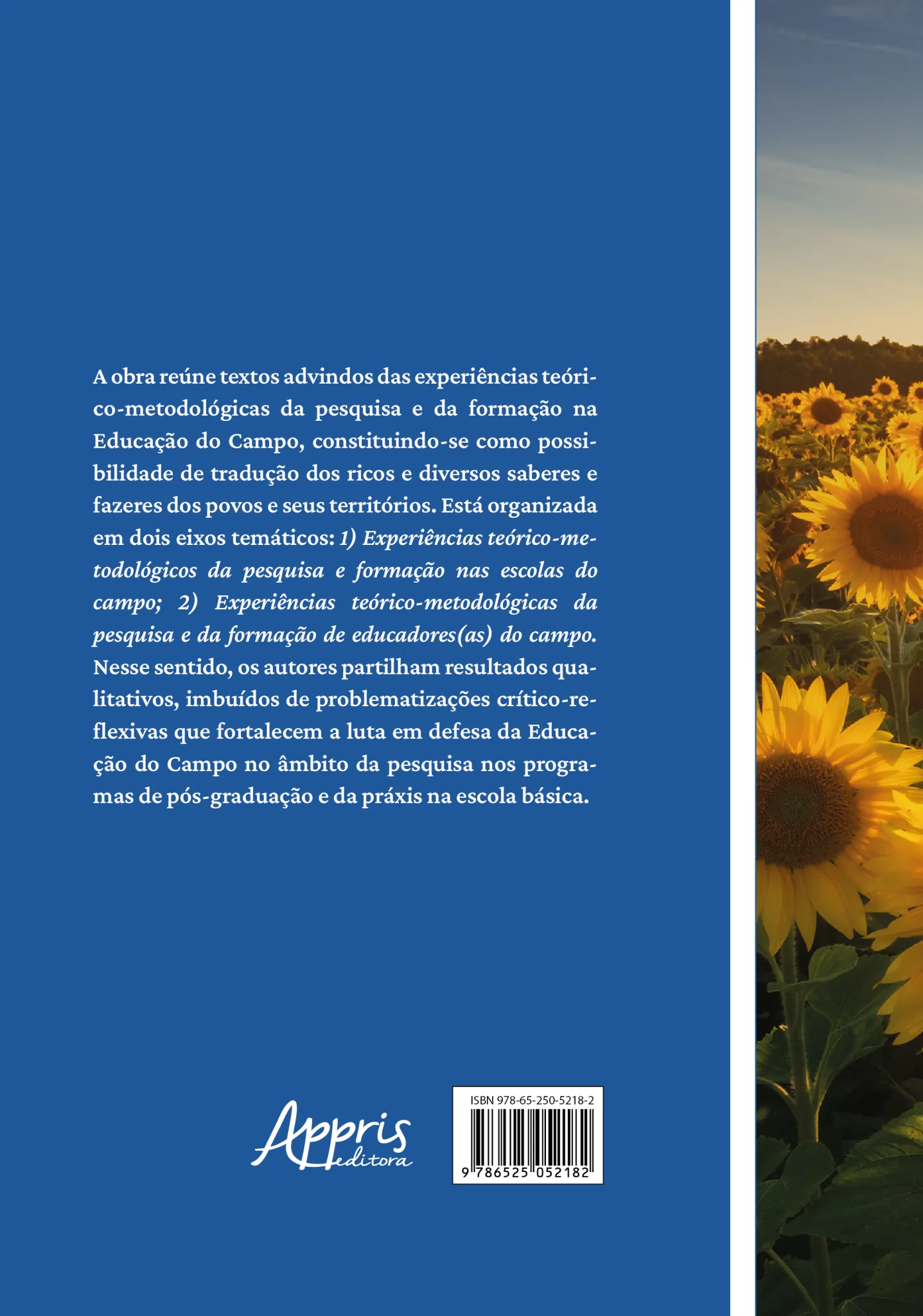 A obra reúne textos advindos das experiências teórico-metodológicas da pesquisa e da formação na Educação do Campo, constituindo-se como possibilidade de tradução dos ricos e diversos saberes e fazeres dos povos e seus territórios. Está organizada em dois eixos temáticos: 1) Experiências teórico-metodológicos da pesquisa e formação nas escolas do campo; 2) Experiências teórico-metodológicas da pesquisa e da formação de educadores(as) do campo. Nesse sentido, os autores partilham resultados qualitativos, imbuídos de problematizações crítico-reflexivas que fortalecem a luta em defesa da Educação do Campo no âmbito da pesquisa nos programas de pós-graduação e da práxis na escola básica.