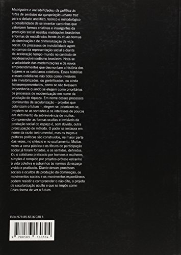 Descortinar as invisibilidades das metrópoles; trazer luz aos invisíveis, aos excluídos da sociedade, marginalizados de alguma forma – é este o foco deste livro. Os invisíveis são aqueles muitos sujeitos que também contribuem na estrutura produtiva das cidades, mas que têm acesso dificultado aos direitos sociais e às políticas publicas, bem como não possuem lugar garantido no sistema de divisão do território em propriedades. Por não se encaixarem claramente em nenhuma parcela, costumam ser malvistos por grande parte da sociedade e não ganham a atenção das autoridades.